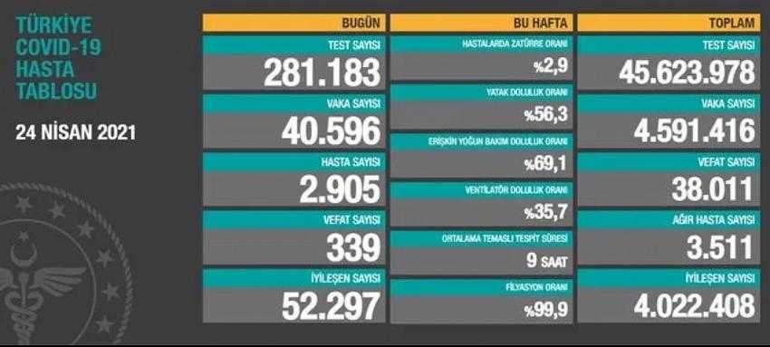 Sağlık Bakanlığı, 24 Nisan Türkiye Günlük Korona Tablosu'nu paylaştı.