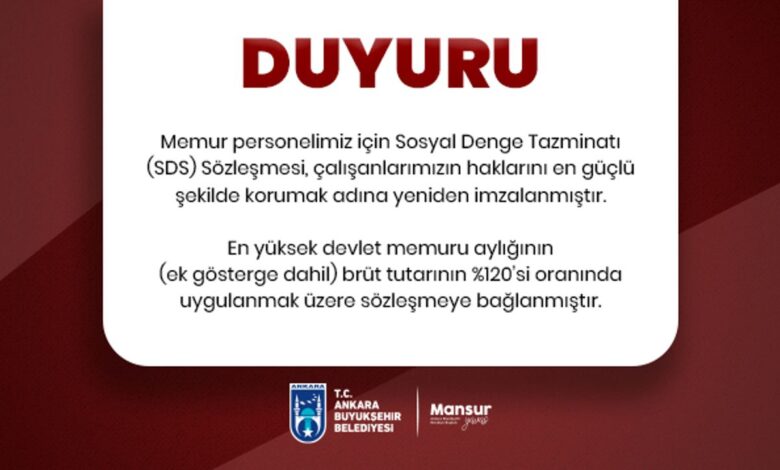 2026–2027 yıllarını kapsayan 8. Dönem Toplu Sözleşme doğrultusunda belirlenen tavan tutar esas alınarak SDS’nin, en yüksek devlet memuru aylığının, ek gösterge dâhil, brüt tutarının yüzde 120’si oranında uygulanması karara bağlandı. ABB, yapılan sözleşme ile memur personelin mali haklarında güvenceyi sürdürmeyi hedefliyor.