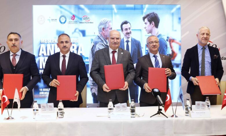 Ankara Ticaret Odası, Ankara İl Milli Eğitim Müdürlüğü, Ankara Çalışma ve İş Kurumu İl Müdürlüğü (Ankara İŞKUR), Gazi Üniversitesi ve OSTİM Teknik Üniversitesi arasında gerçekleştirilen “Mesleki Eğitimde Ankara Modeli Protokolü”nün imza töreni, ATO Duatepe Salonu’nda yapıldı. Ankara’da nitelikli insan gücü yetiştirilmesi amacı doğrultusunda istihdam, eğitim ve sektörler arasındaki işbirliğinin güçlendirilmesi, sektörlerde yaşanan gelişmelerle eğitim sisteminin uyumlaştırılması ve iş dünyasının ihtiyaç duyduğu nitelikli iş gücünün karşılanarak istihdama katkı sağlanmasının hedeflendiği protokole, ATO Yönetim Kurulu Başkanı Gürsel Baran, Gazi Üniversitesi Rektörü Prof. Dr. Uğur Ünal, OSTİM Teknik Üniversitesi Rektör Yardımcısı Prof. Dr. Ünsal Sığrı, Ankara İl Milli Eğitim Müdürü Murat Küçükali ve Ankara Çalışma ve İş Kurumu İl Müdürü Arif Ay imza koydu.