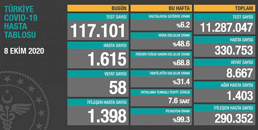 Sağlık Bakanlığı, 8 Ekim Türkiye Günlük Korona Tablosu'nu paylaştı.