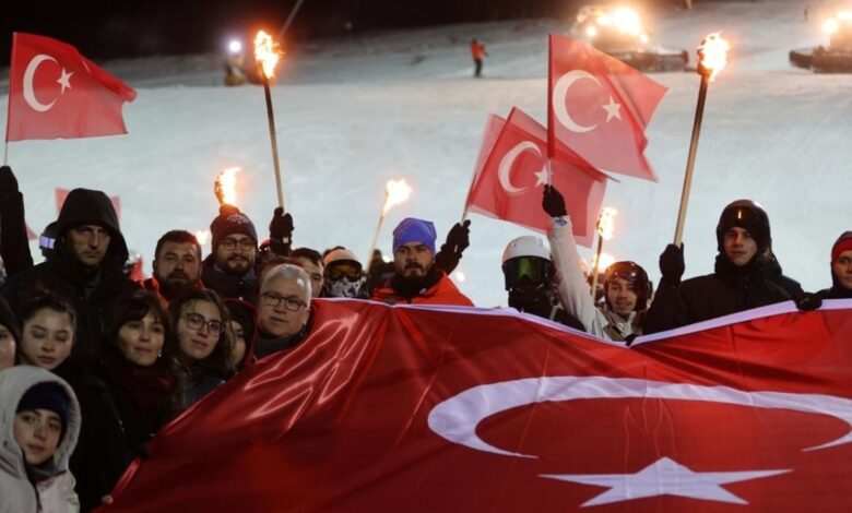 Kayakçılar ellerinde Türk bayraklarıyla pistlerden kaydı